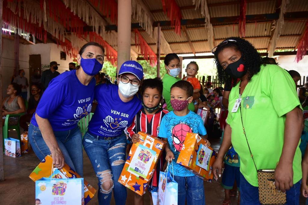Crianças carentes de famílias de catadores de materiais recicláveis e reutilizáveis de Várzea Grande receberem na manhã desta quinta-feira (08.10) brinquedos e guloseimas da primeira-dama,