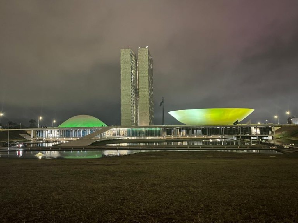 O Congresso recebe iluminação verde (Senado) e amarela (Câmara dos Deputados) em alusão ao jogo entre as seleções brasileira e peruana de futebol pela 10ª