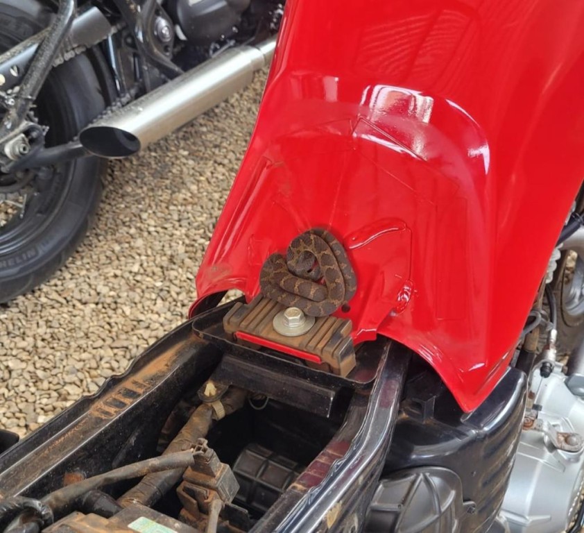 O Corpo de Bombeiros Militar de Mato Grosso (CBMMT) resgatou, na manhã desta quinta-feira (6.2), uma serpente peçonhenta que estava dentro de uma motocicleta no