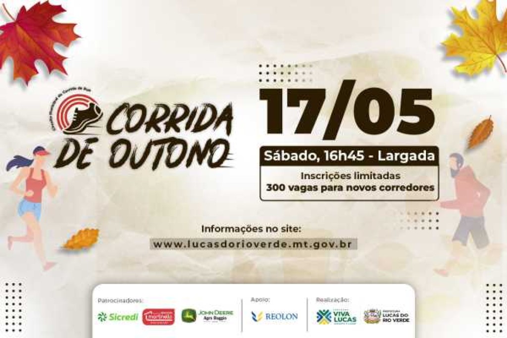 Estarão abertas a partir desta quarta-feira (30), às 19h, as inscrições para a segunda etapa de Corridas de Rua – Corrida de Outono de Lucas