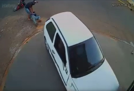 Imagens de uma câmera de segurança captaram o momento exato em que dois ocupantes de uma motocicleta são violentamente atropelados por um veículo Volkswagen Gol