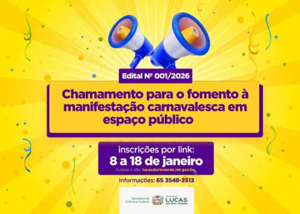 A Secretaria Municipal de Cultura e Turismo de Lucas do Rio Verde abre inscrições para o Edital nº 001/2026, voltado ao fomento de manifestações carnavalescas