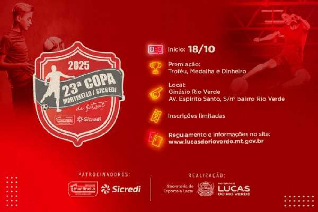As inscrições para a 23ª Copa Martinello/Sicredi de Futsal 2025 já estão abertas e seguem até o dia 13 de outubro. A competição, uma das mais tradicionais do esporte em Lucas do Rio Verde, terá início no dia 18 de outubro, com jogos no Ginásio Rio Verde, localizado no bairro Rio Verde e Ginásio Pimpão, no bairro Menino Deus.