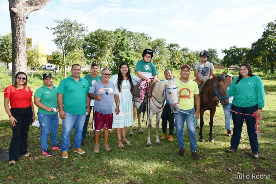 É um Projeto de Equoterapia, que permite o acompanhamento das pessoas portadoras de necessidades especiais, sendo uma parceria do Senar; Sindicato Rural e Prefeitura, por meio da Secretaria Municipal de Saúde, quando os trablhos foram retomados sem Leverger este ano. A prefeita, Francieli Magalhães visitou o estande, onde está sendo realizado o trabalho de reabilitação dos pacientes, contando com profissionais capacitados. Cerca de 20 pessoas estão sendo acompanhadas, em dias alternados, pelos profissionais da saúde, como por exemplo: Psicológos e fisioterapeuta.