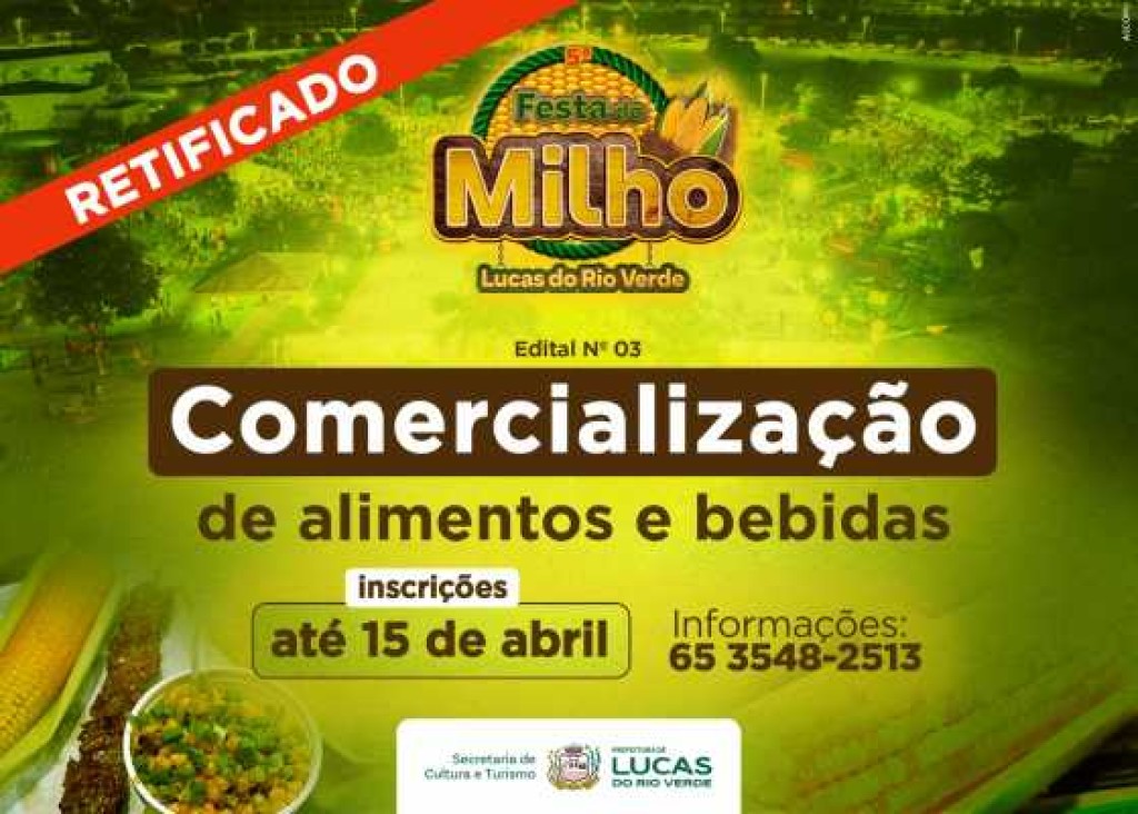 A Prefeitura de Lucas do Rio Verde, por meio da Secretaria de Cultura e Turismo, divulgou a Retificação nº 01 do Edital de Seleção nº 003/2026, que trata da exploração comercial de alimentos e bebidas na praça de alimentação da 5ª Festa do Milho, marcada para os dias 09 e 10 de maio de 2026.