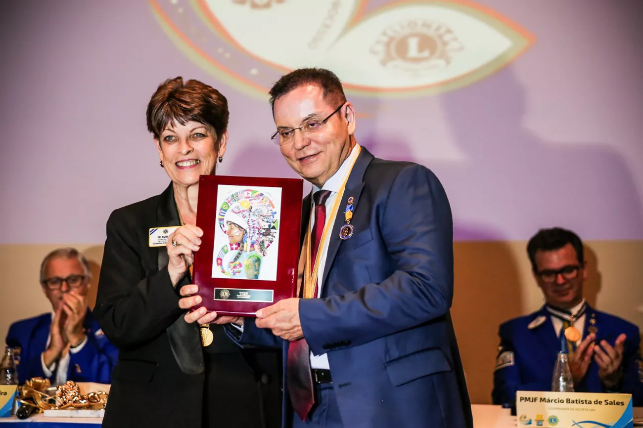 O deputado estadual Eduardo Botelho (União) foi homenageado pelo Lions Clube de Mato Grosso, durante evento, que contou com a presença da presidente do Lions Internacional, Patti Hill.