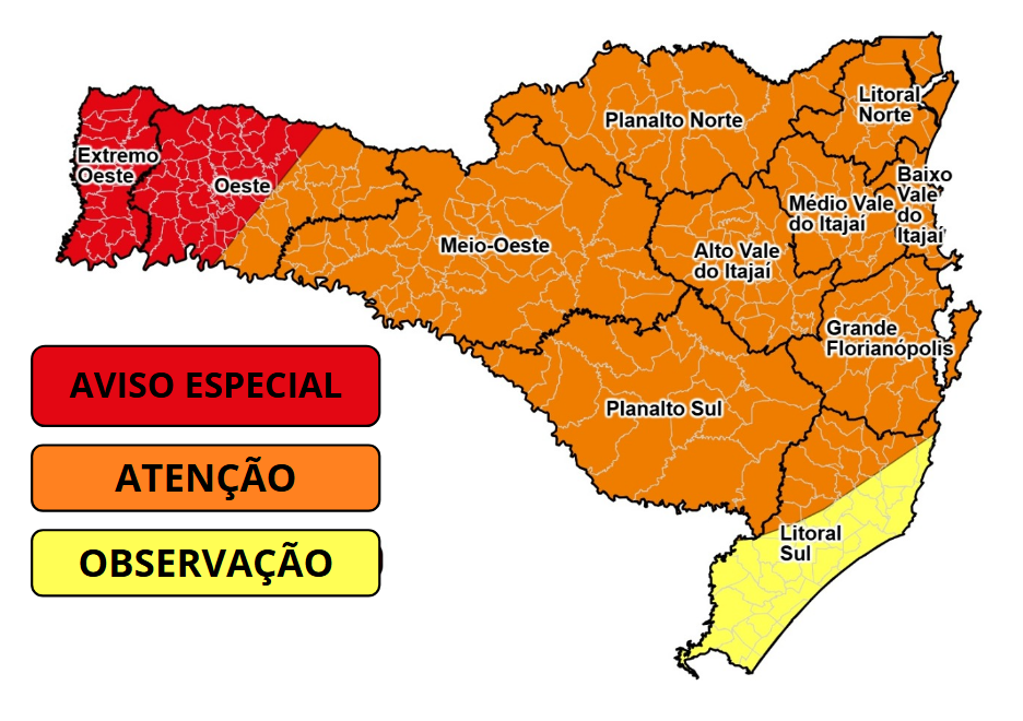 A previsão anterior, divulgada ontem (03), indicava um grau de severidade alta. Essa condição se mantém ao longo da quinta-feira (05) no Meio Oeste, Planaltos, Vale do Itajaí e Litoral. Com a atualização, a expectativa é de chuvas intensas em curto período de tempo, vendavais, queda de granizo e descargas elétricas, com potencial para alagamentos, enxurradas, destelhamentos, queda de árvores e danos à rede elétrica.
