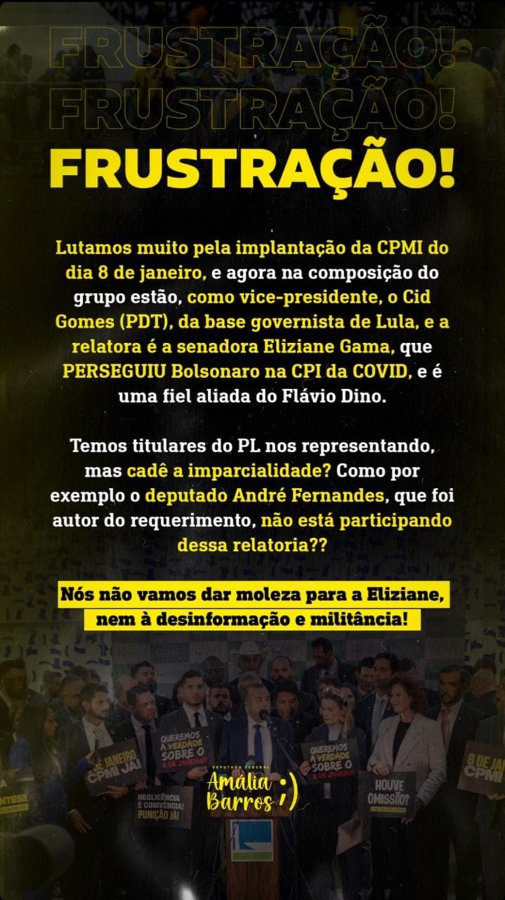 Amália questiona a imparcialidade da Comissão, e acusa a relatora de ter “perseguido” o ex-presidente da República, Jair Bolsonaro (PL), na CPI da Covid em 2021, e de ser fiel aliada do ministro da Justiça Flávio Dino (PSB). “Nós não vamos dar moleza para Eliziane, nem à desinformação e militância”, conclui a deputada.