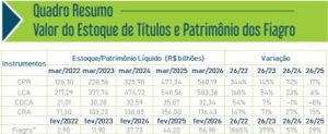 Os Certificados de Recebíveis do Agronegócio (CRA) apresentaram estoque de R$ 176,43 bilhões em março de 2026, alta de 15% em 12 meses. Os Fundos de Investimento nas Cadeias Produtivas do Agronegócio (Fiagro) alcançaram patrimônio líquido de R$ 56,98 bilhões, crescimento de 29% sobre março de 2025, com 221 fundos em operação, o que representa 60% mais que no ano anterior.