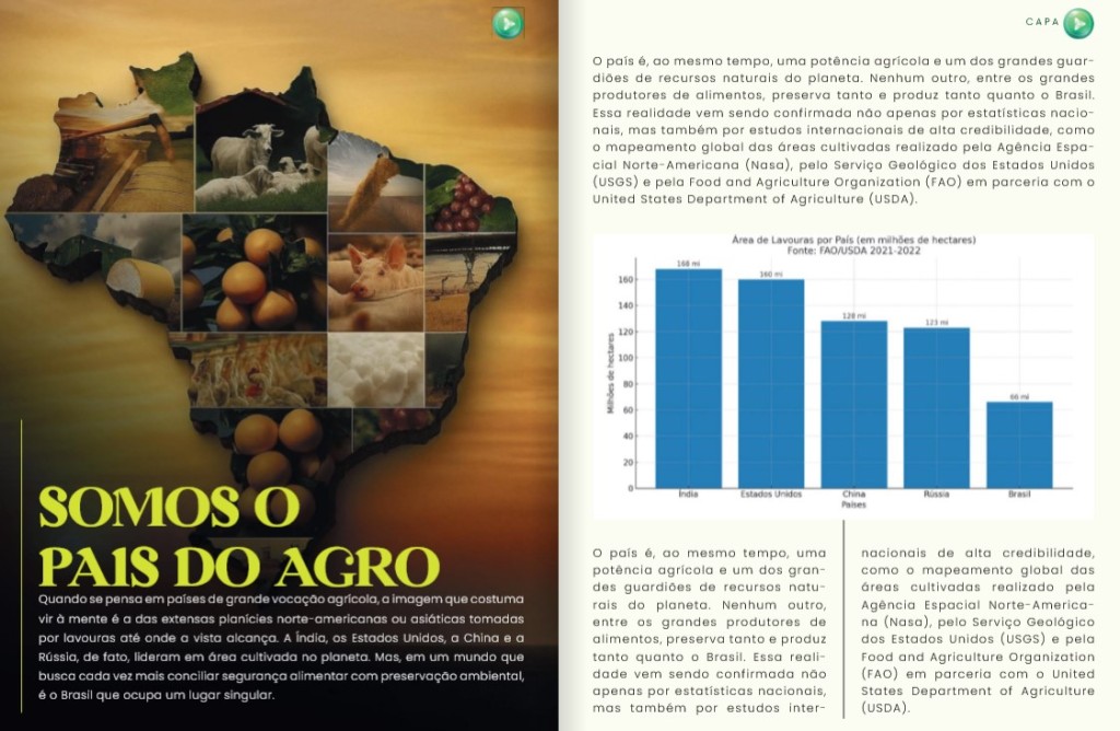 A reportagem de capa da edição de agosto da Revista Pensar Agro joga luz sobre um dos maiores paradoxos da agricultura global: como o Brasil consegue ser, ao mesmo tempo, uma das maiores potências agrícolas do planeta e o país que mais preserva vegetação nativa entre os grandes produtores de alimentos. O relatório ressalta que, enquanto Índia, Estados Unidos, China e Rússia concentram as maiores áreas cultivadas, é o Brasil que apresenta um modelo único, baseado em alta produtividade em espaço relativamente reduzido e na manutenção de vastas áreas de conservação.