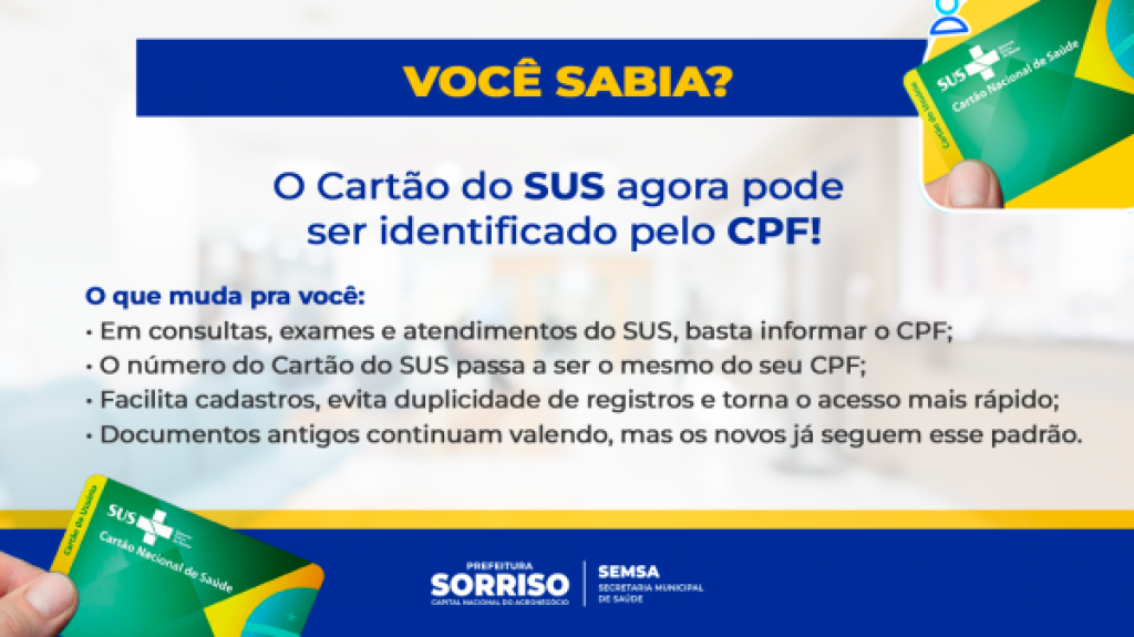 A partir de agora, o CPF será o identificador único no Cartão Nacional de Saúde (CNS). O documento, que não precisa ser impresso, estará disponível em formato digital e exibirá informações básicas como nome, CPF, sexo e data de nascimento, substituindo o número antigo.