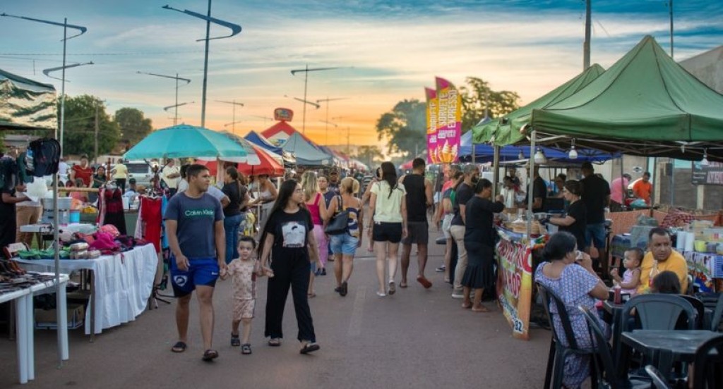 #PraTodosVerem: A imagem mostra uma feira ao ar livre, a Feira do Nova Barra, com várias barracas montadas nas laterais de uma rua. Há muitas pessoas caminhando, comprando e conversando, inclusive famílias com crianças. O ambiente é movimentado e descontraído, em clima de final de tarde, com o céu colorido pelo pôr do sol.