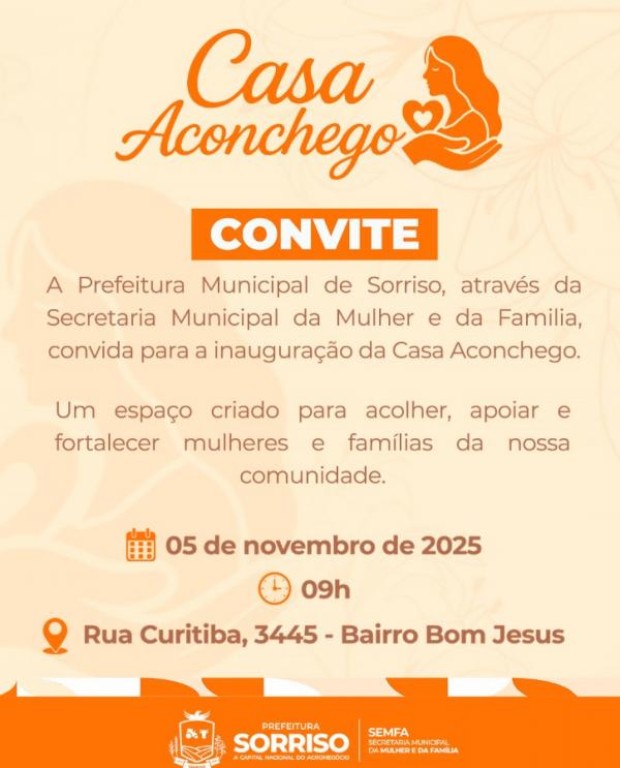 A partir de 05 de novembro, Sorriso contará com um local especial e único. Trata-se da Casa Aconchego, situada na Avenida Curitiba, n.º 3445, no Bom Jesus. O local abrigará em um único espaço vários serviços destinados às mulheres e famílias sorrisenses. O local também abrigará a sede da Secretaria da Mulher e da Família (Semfa).