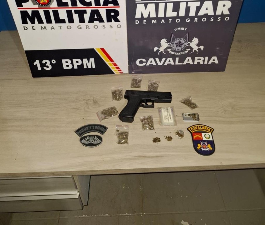 Equipes do 1º Esquadrão de Policiamento Montado de Lucas do Rio Verde (332 km de Cuiabá) apreenderam, nesta quarta-feira (15.10), um jovem, de 17 anos, por tráfico ilícito de drogas e apologia à facção criminosa no município. O menor foi flagrado com simulacro de arma de fogo e diversas porções de entorpecentes. Ele possui inúmeras passagens criminais.