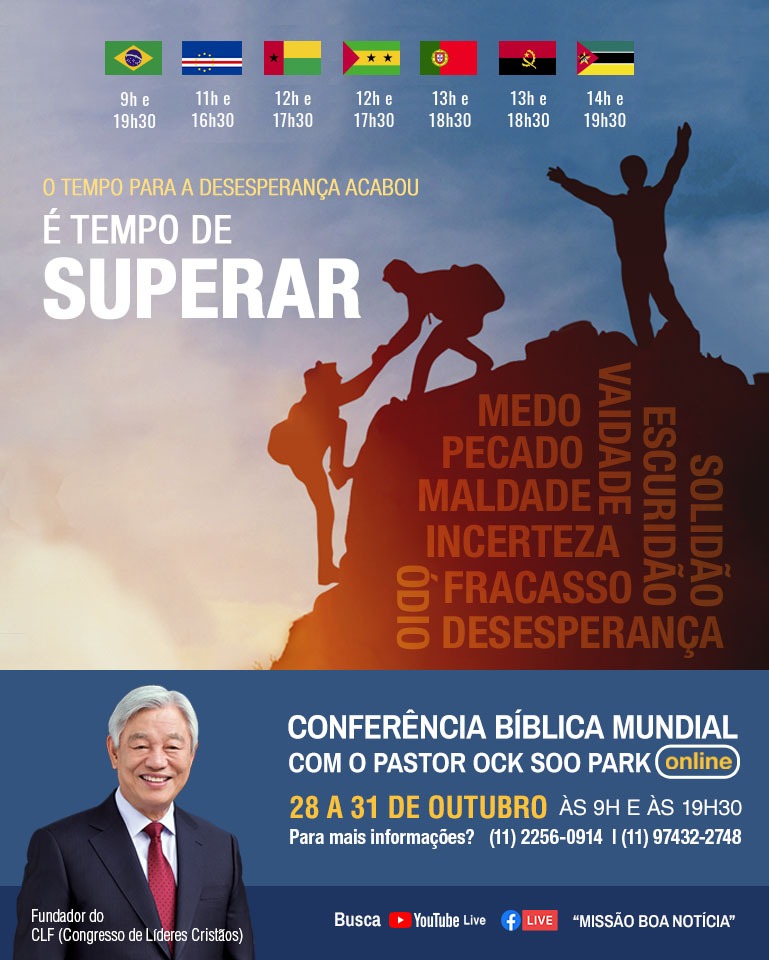 Nos dias 28 a 31 de outubro, a Igreja Missão Boa Notícia realizará a Conferência Bíblica Mundial online 2020. As pregações serão transmitidas em dois horários: às 09h00 da manhã e às 19h30, através das plataformas ZOOM, Facebook e YouTube, para todo o Brasil e em mais de 94 países.