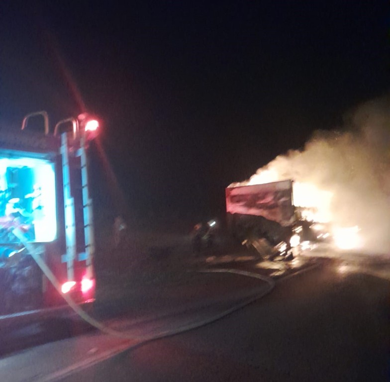 Antes que as chamas atingissem o cavalo mecânico da carreta, o proprietário conseguiu separá-lo do compartimento de carga, evitando que o fogo se espalhasse por todo o veículo.