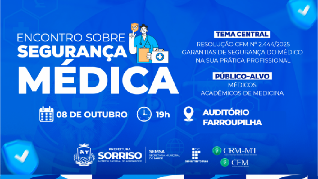 Sorriso sedia nesta quarta-feira (08) um encontro voltado à Segurança Médica. O evento será realizado às 19h, no Auditório Farroupilha, e traz debates sobre Garantias de Segurança do médico na sua prática profissional, bem como aspectos éticos, jurídicos e institucionais que envolvem o exercício da Medicina, com base na nova resolução do CFM n.º 2.444/2025.