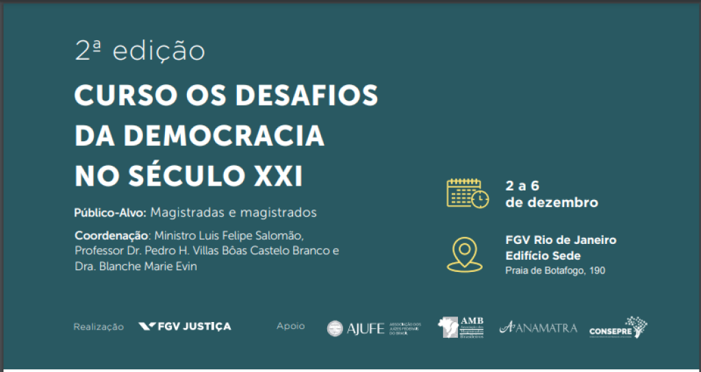 Magistrados e magistradas interessados em participar do curso ‘Os desafios da democracia no século XXI – 2ª edição’, têm até as 23h59 do dia 8 de novembro para realizar as inscrições´. A ação conta com a coordenação do vice-presidente do Superior Tribunal de Justiça (STJ), ministro Luis Felipe Salomão, e tem como principal objetivo capacitar magistrados(as) para os desafios contemporâneos da democracia, com ênfase na teoria, na prática, e, sobretudo, no papel fundamental do Judiciário na preservação dos valores democráticos.Ofertado pela Fundação Getúlio Vargas Justiça (FGV Justiça), o curso será realizado entre os dias 2 e 6 de dezembro, na sede da FGV, em Botafogo, Zona Sul do Rio de Janeiro. Tanto a inscrição como as aulas são gratuitas para juízes(as) e desembargadores(as). Ao todo, são oferecidas 50 vagas para magistrados dos diferentes ramos da Justiça.