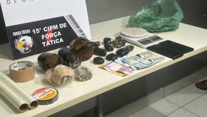 Foram apreendidas porções de maconha, cocaína e fumo, além de celulares, R$ 41 em espécie, balança de precisão, carregadores, fones de ouvido, agulhas para tatuagem, plástico filme e fita adesiva — itens frequentemente usados no tráfico de drogas.