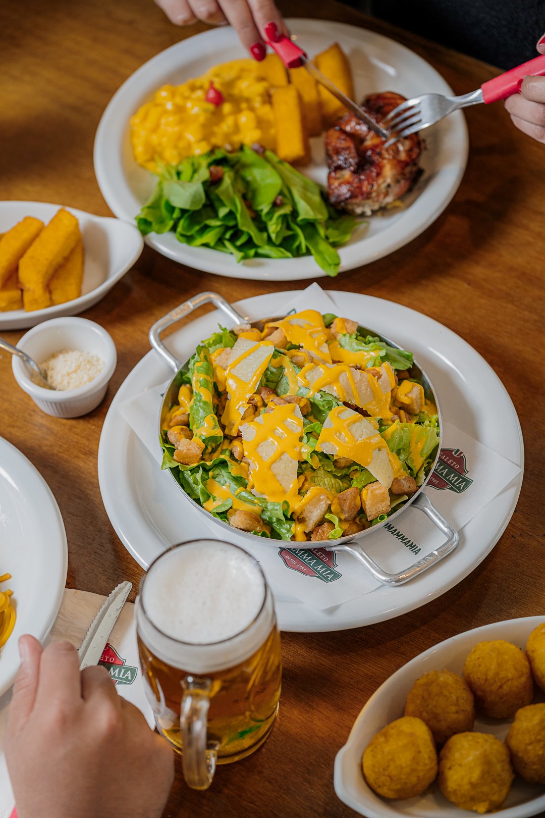 Entre as opções, estão o galeto assado na brasa com tempero exclusivo, massas frescas com molhos variados, polenta frita crocante, salada de radicci com bacon e a clássica sopa de capeletti. O radicci, inclusive, é orgânico e cultivado nas terras da família Cavichioni, que pertenceram ao avô paterno do fundador da rede, Julinho Cavichioni. As sobremesas — como pudim de leite e sagu — e bebidas como vinho em taça e chopp completam a experiência.