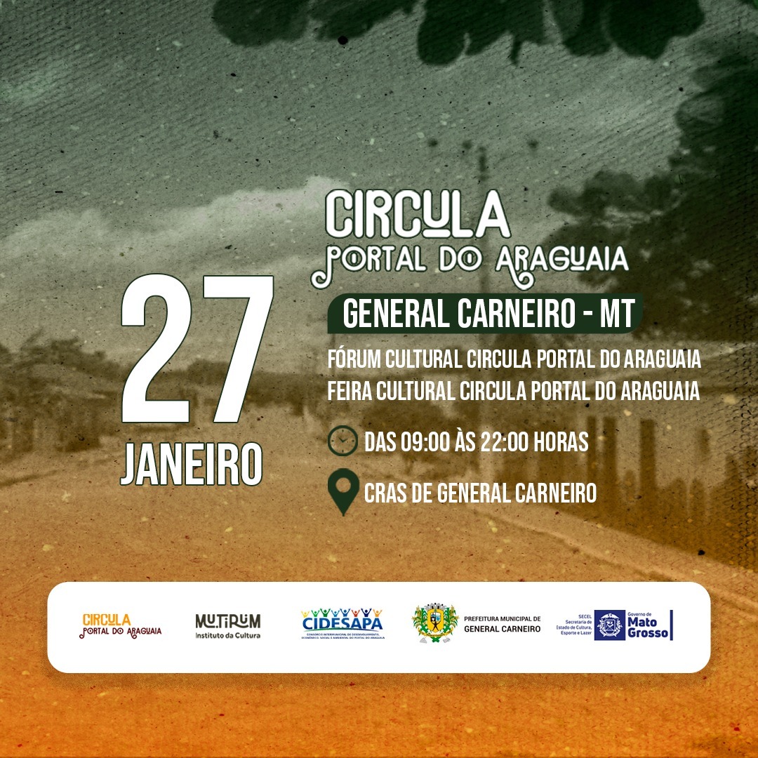 Acontece nessa sexta-feira (27) em General Carneiro, no Centro de Referência de Assistência Social (CRAS), o programa cultural do Projeto Circula Portal do Araguaia, uma realização de uma feira e um fórum de cultura. As atividades serão realizadas por meio da parceria do Projeto Circula Portal do Araguaia, da prefeitura do município, do Consórcio Intermunicipal de Desenvolvimento Econômico, Social e Ambiental do Portal do Araguaia (CIDESAPA) e da Secretaria de Estado Cultura, Esporte e Lazer de Mato Grosso (Secel).