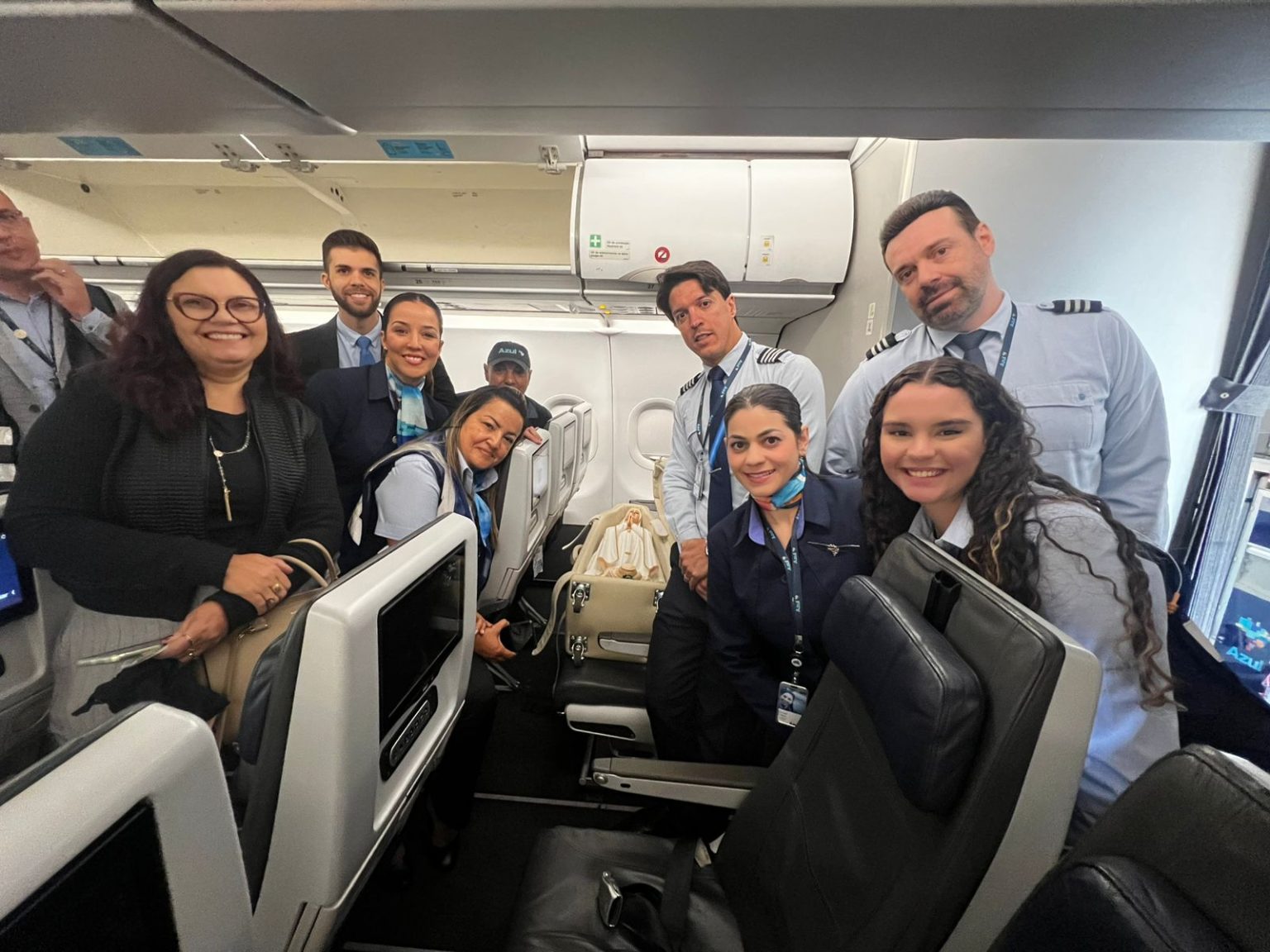 Durante o voo de São Paulo a Várzea Grande, passageiros se emocionaram ao ver a imagem no interior da aeronave, registrando um dos momentos mais simbólicos da jornada da santa em solo brasileiro. Em Poconé, ela participará de missas, procissões e celebrações até o sábado (24), quando será coroada.