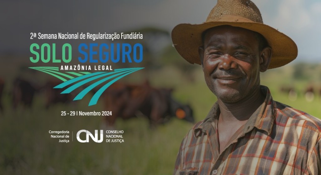 #ParaTodosVerem: esta matéria possui recursos de texto alternativo para promover a inclusão de pessoas com deficiência visual. Foto 1: peça publicitária com imagem de um homem negro usando chapéu de palha e camisa xadrez. Ao fundo, uma fazenda com bois desfocados. No canto direito, está a logo da 2ª edição da Semana Nacional de Regularização Fundiária Solo Seguro – Amazônia Legal e a data 25-29 de novembro de 2024.