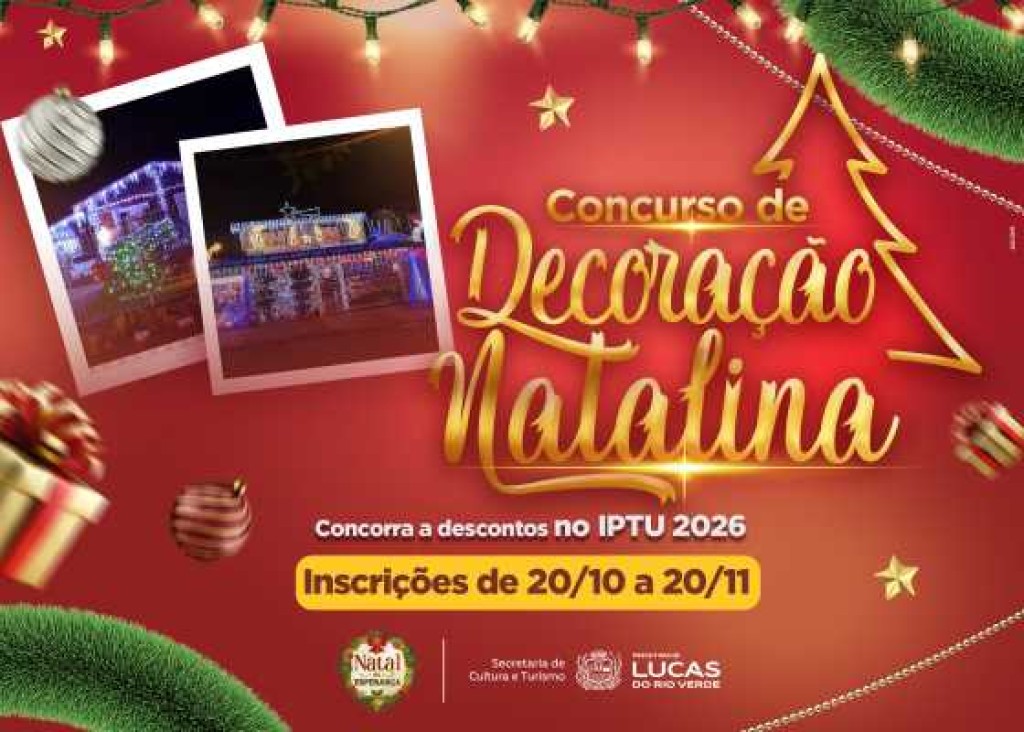 A Prefeitura de Lucas do Rio Verde, por meio da Secretaria de Cultura e Turismo, abrirá, nesta segunda-feira (20), as inscrições para o Concurso de Decoração Natalina 2025, que seguem até o dia 20 de novembro.