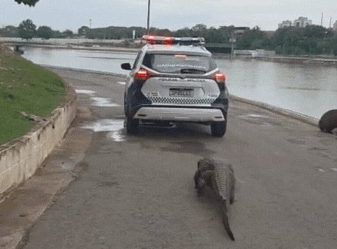 Um jacaré adulto conhecido como “Celso” foi flagrado nesta quinta-feira (5) perseguindo uma viatura da Polícia Militar de Mato Grosso no Parque das Águas, em Cuiabá. Segundo os policiais, o animal saiu do lago e passou a seguir o veículo assim que o giroflex foi ligado.