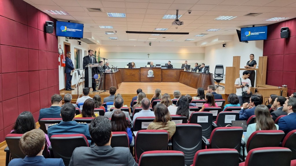 #PraTodosVerem – Imagem captura o momento em que o juiz Jean Bezerra faz seu discurso de posse, no plenário do TRE-MT, tendo atrás dele os integrantes da Corte Eleitoral. As paredes laterais do ambiente são revestidas em um painel acolchoado de cor vinho ou bordô. A plateia, em primeiro plano, está voltada para o orador e a mesa, composta por diversas pessoas vestidas socialmente, sentadas em cadeiras com assentos vermelhos e encostos pretos, atentas ao evento.