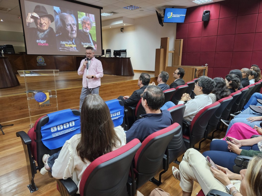 Na reta final de 2024, o Tribunal Regional Eleitoral de Mato Grosso (TRE-MT) realizou palestra com o tema “Humanidade e Tecnologia: Uma Nova Forma de Pensar Juntos”, na manhã desta sexta-feira (13.12), no Plenário, localizado na sede do Tribunal. O assunto foi abordado pelo doutor e mestre em Educação pela Pontifícia Universidade Católica do Rio Grande do Sul (PUC-RS), Augusto Niche Teixeira.