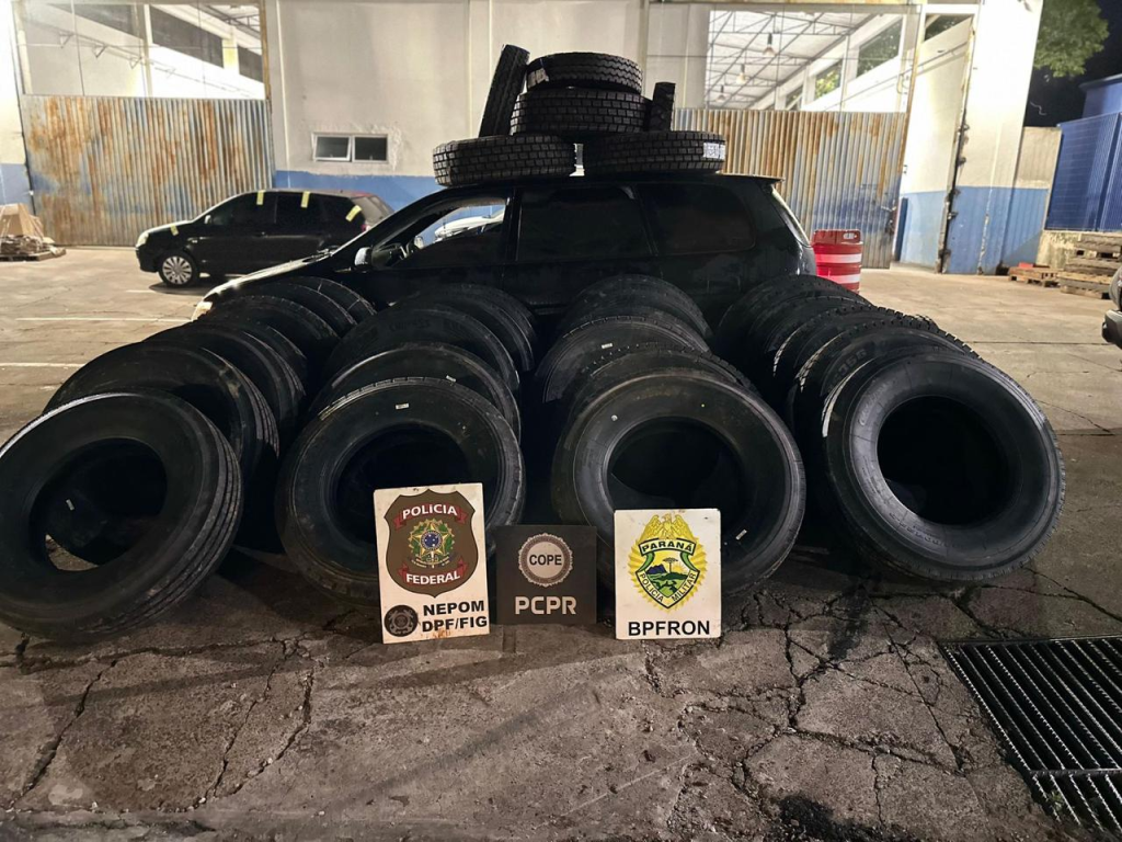 Foz do Iguaçu/PR. A Polícia Federal, a Polícia Civil e a Polícia Militar do Paraná apreenderam um veículo e 84 pneus contrabandeados, na última quinta-feira (14/8), em Foz do Iguaçu/PR.