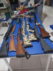 Com a dupla, foram apreendidas uma pistola, duas carabinas, cinco espingardas, três mil munições de diversos calibres, além de celulares, dinheiro, facas e uma motocicleta. Um dos presos já possui passagens por porte ilegal de arma, crimes ambientais e direção perigosa. Ambos foram levados à delegacia.