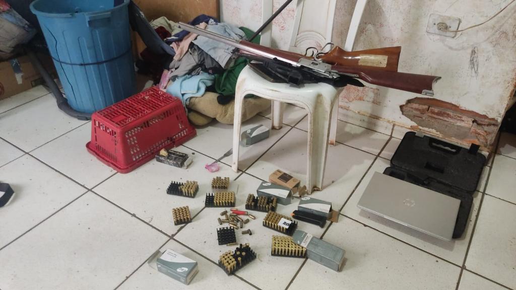 Nesta terça-feira, foram cumpridas três prisões dos investigados. Em uma das residências alvo das buscas foram apreendidas 185 munições de calibre 9 mm e um carregador de pistola.