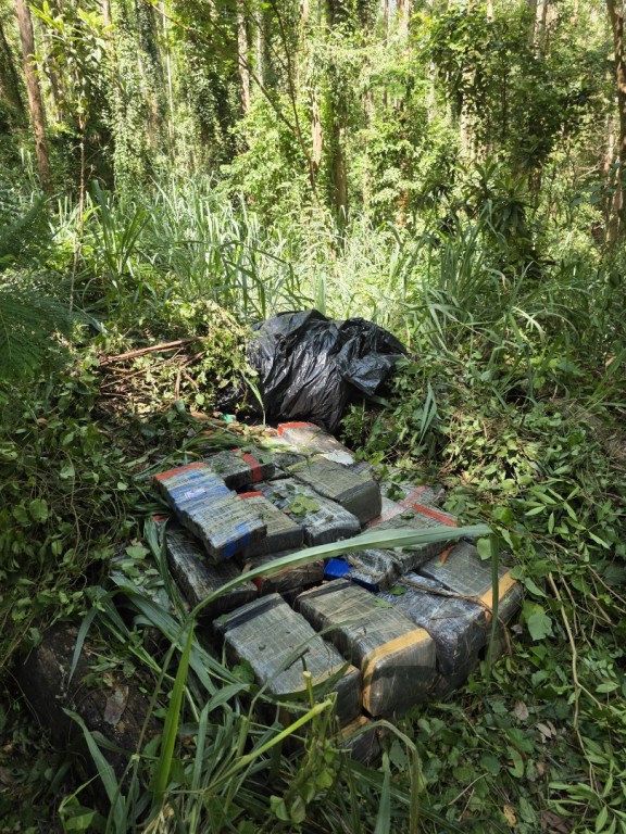 A equipe realizava patrulhamento na região quando identificou marcas de veículos acessando uma estrada vicinal. Durante buscas no local, os policiais localizaram a droga escondida em uma área de mata. Nenhuma pessoa foi encontrada.