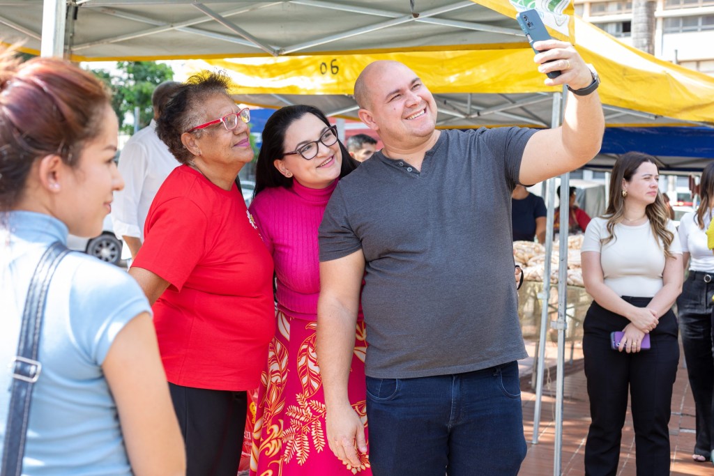 Na imagem principal, o prefeito Abilio Brunini e a primeira-dama Samantha Iris fazem uma self com uma senhora de óculos. Ao fundo várias barraquinhas onde estão sendo feitos os serviços na Praça Alencastro. Na galeria, outras imagens mostram mulheres sendo atendidas em diversas frentes, como corte de cabelo, manicure, assessoria jurídica, vacinação e aferição de pressão.