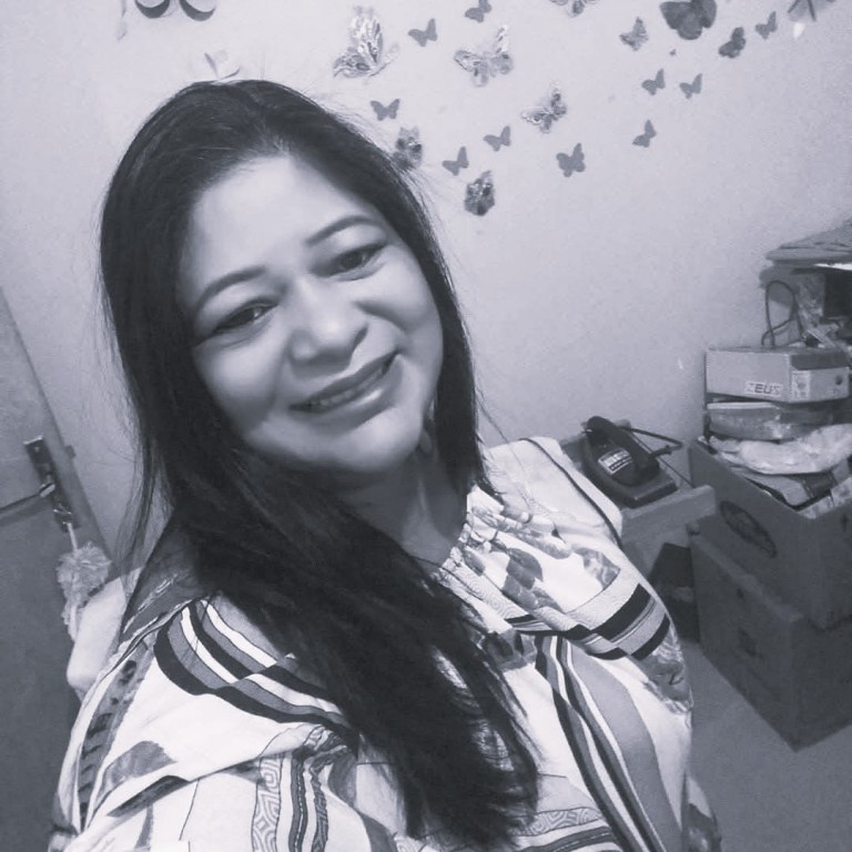 A imagem mostra uma fotografia da professora Francisca Maria da Silva, com filtro em preto e branco.