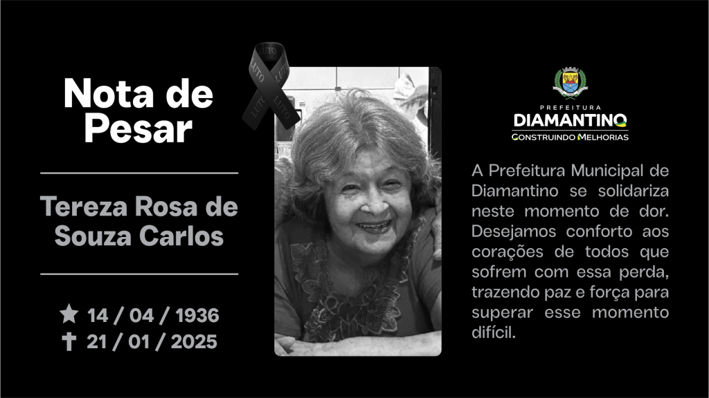 É com profundo pesar que a Administração Municipal de Diamantino comunica o falecimento de Tereza Rosa de Souza Carlos, mãe da primeira-dama e Secretária Municipal de Assistência Social, Trabalho e Cidadania do município, Jaqueline Aparecida Carlos Mendes e sogra do Prefeito Municipal.