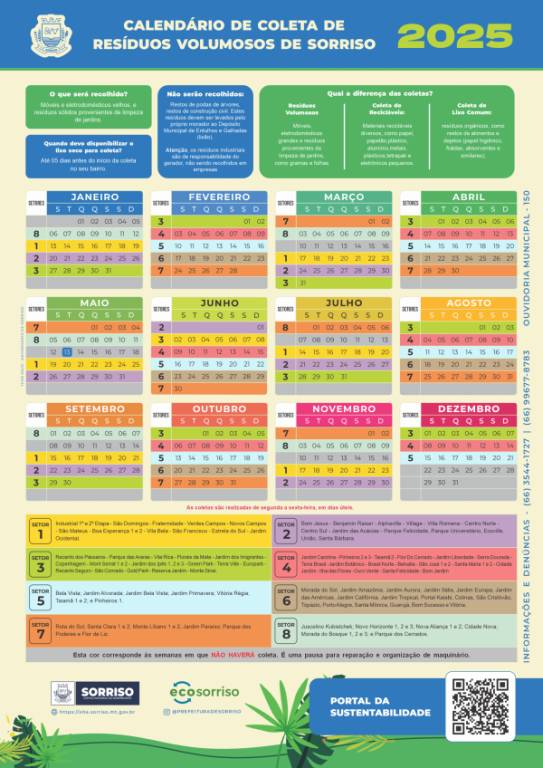 Ah, mas sempre que precisar, o site da Prefeitura, o site.sorriso.mt.gov.br, terá o calendário disponível para ser consultado. Além do calendário, também será possível conferir informações sobre todas as ações de sustentabilidade desenvolvidas pelo Município.