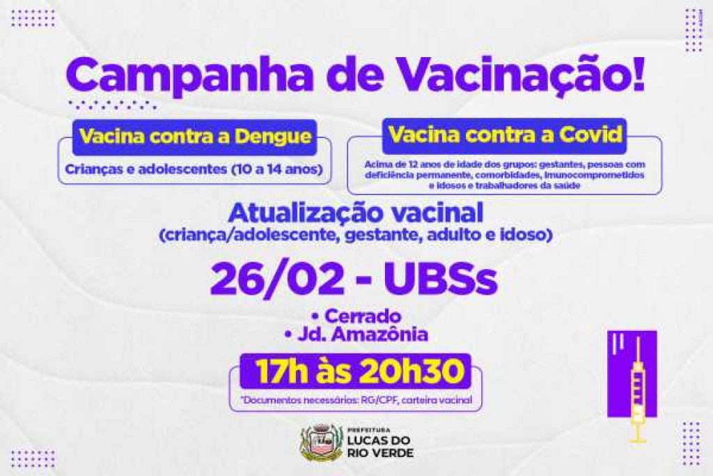 Tem campanha de vacinação, promovida pela Prefeitura de Lucas do Rio Verde, em horário especial. Será das 17h às 20h30, nas unidades básicas de saúde, UBS Cerrado e Jardim Amazônia.