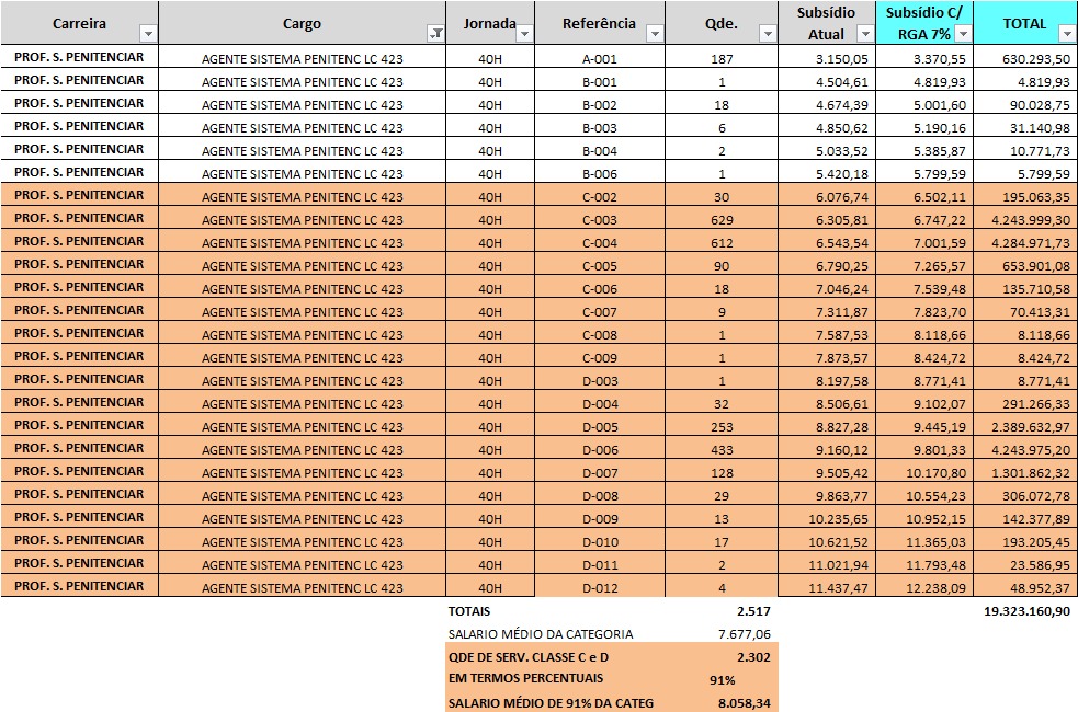 Os 2.302 agentes restantes (91,4%) estão na fase C e D da carreira e recebem de R$ 6,7 mil a R$ 12,2 mil, com salário médio na faixa de R$ 8,05 mil. Os valores consideram a Revisão Geral Anual (RGA) de 7% que será paga neste ano.