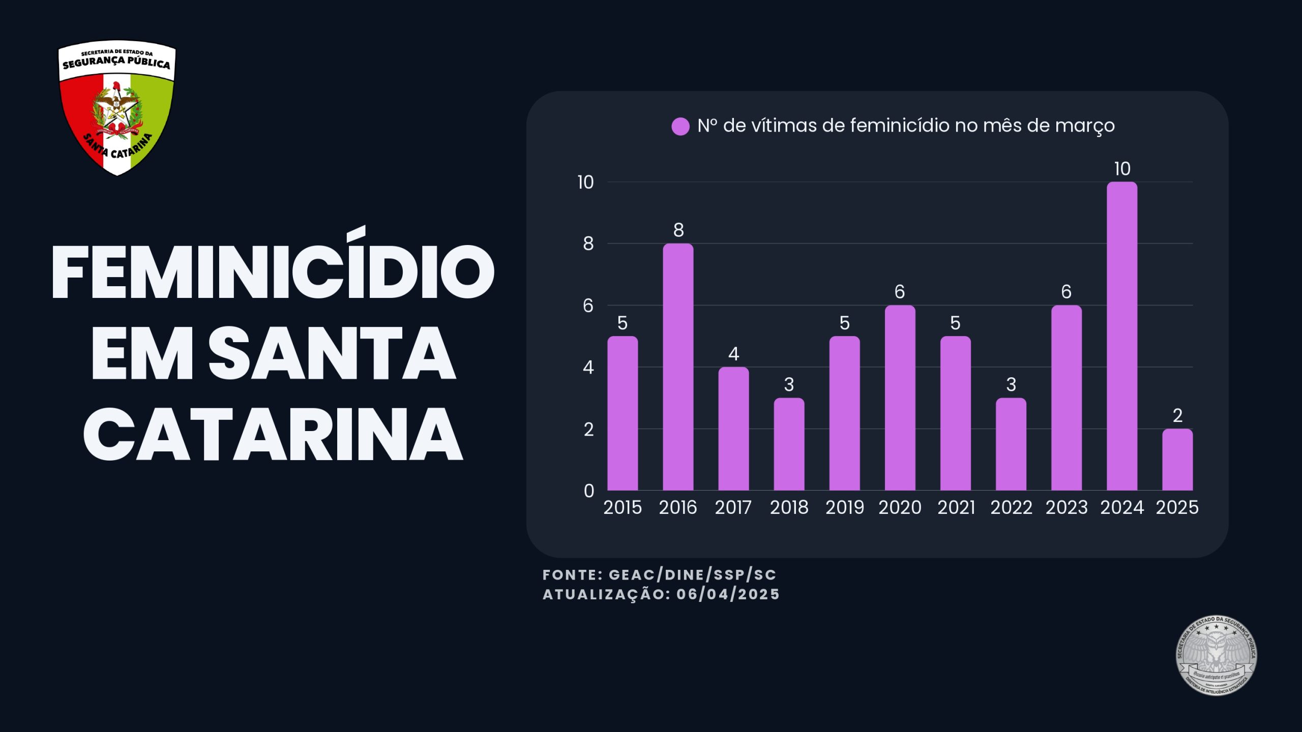 Para o secretário de Estado da Segurança Pública, coronel Flávio Graff, o resultado é fruto do trabalho conjunto das forças policiais e do investimento constante em ações de prevenção e acolhimento. “A redução dos casos de feminicídio em Santa Catarina ao menor índice dos últimos dez anos é resultado do trabalho integrado das nossas Forças de Segurança. Com o apoio constante do governador Jorginho Mello, que tem sido um grande aliado nessa causa, fortalecemos ações como a Rede Catarina, as DPCAMIs, as Salas Lilás e o Botão do Pânico. Seguiremos firmes na proteção das mulheres catarinenses”, destacou o secretário.